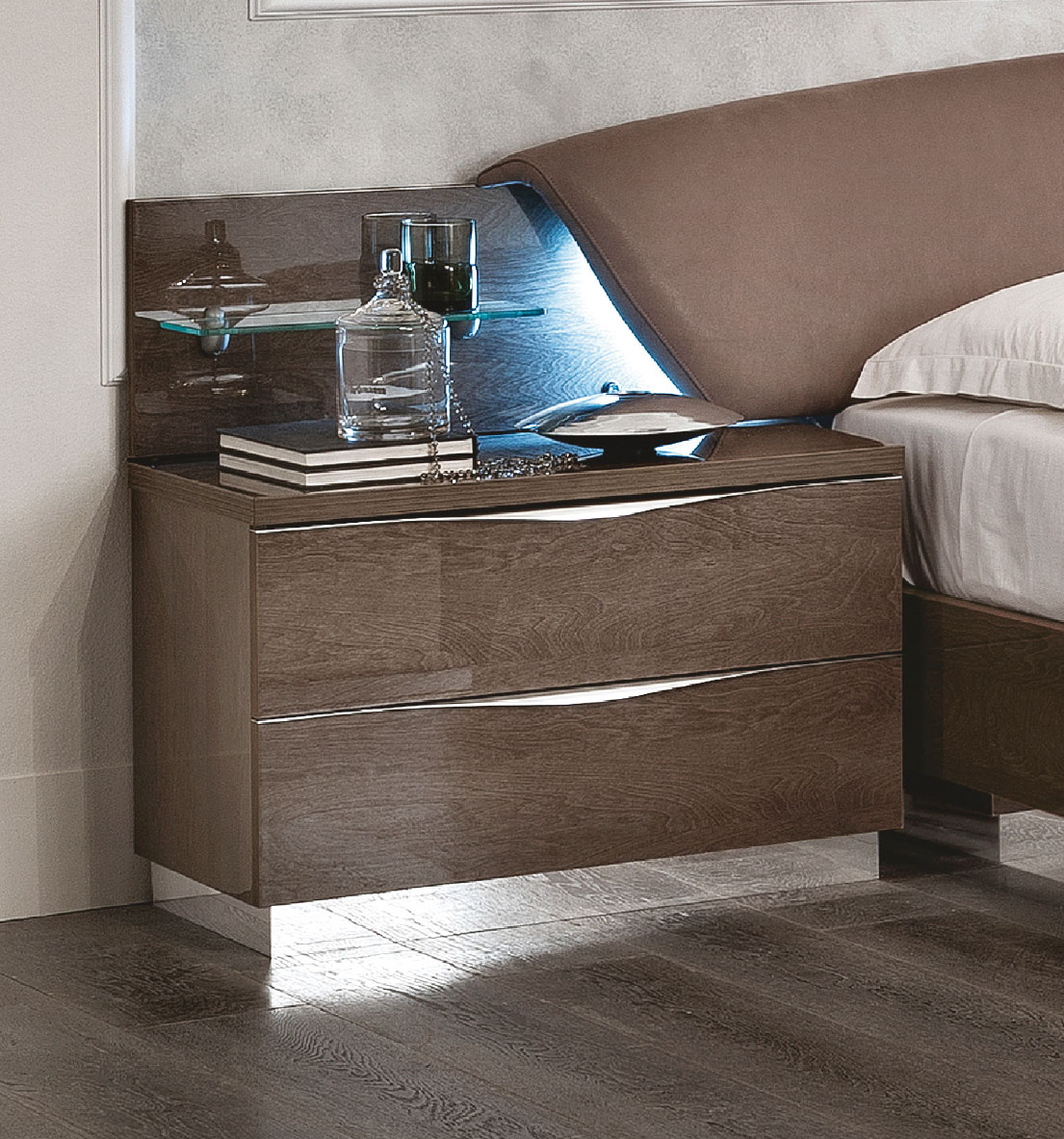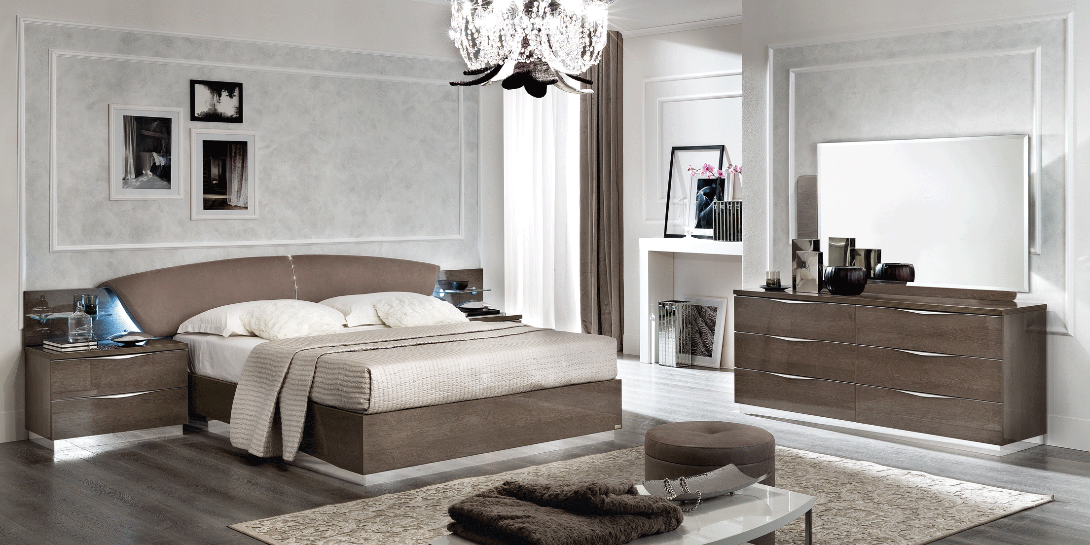 Experience ultimate comfort with the “CRAP” padded eco-leather headboard, which serves as a stunning focal point with its vertical central Swarovski crystal insert. Functionality meets elegance through thoughtful features like beveled mirrors, wave-shaped handles, and lateral glass shelves illuminated by side courtesy lights. The bed ring boasts shaped side rails and a chromed skirt, with the added versatility of an optional storage kit equipped with a lift mechanism. Whether you are redesigning your master suite or looking for a contemporary upgrade, this collection offers a unique, highly sophisticated design that transforms any bedroom into a gallery of Italian luxury.
