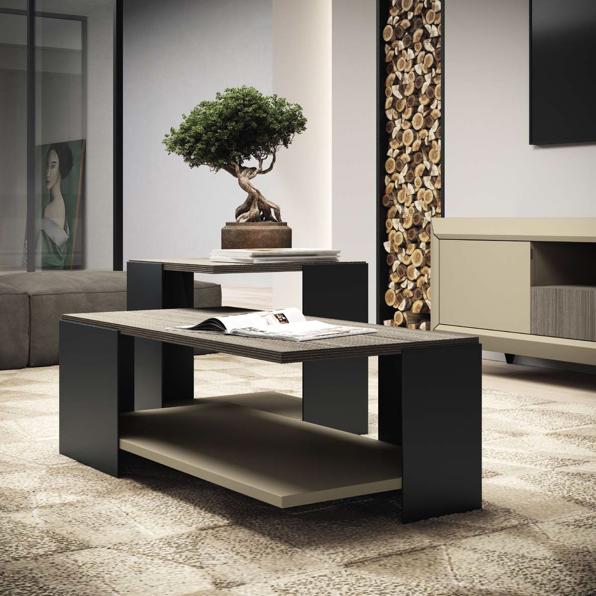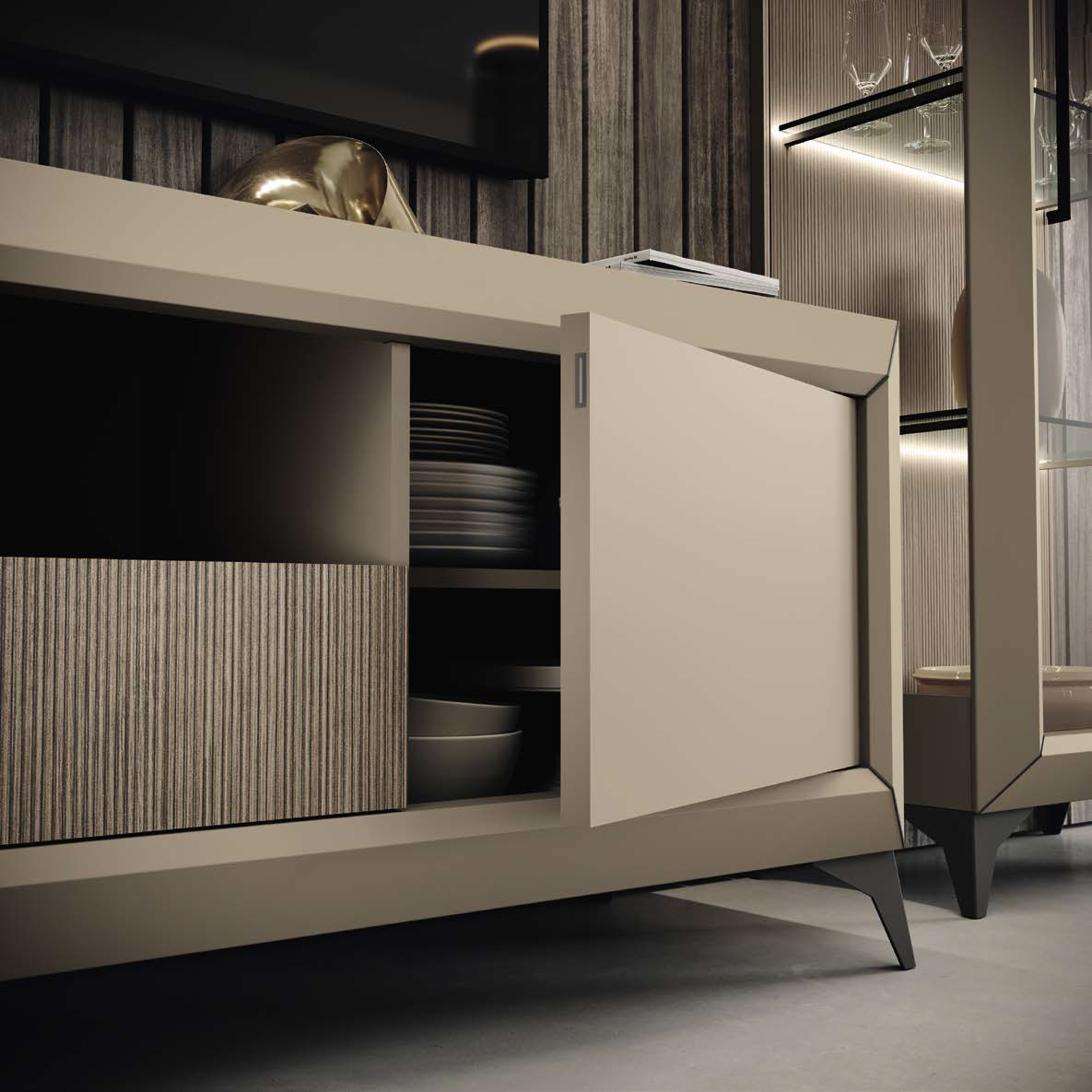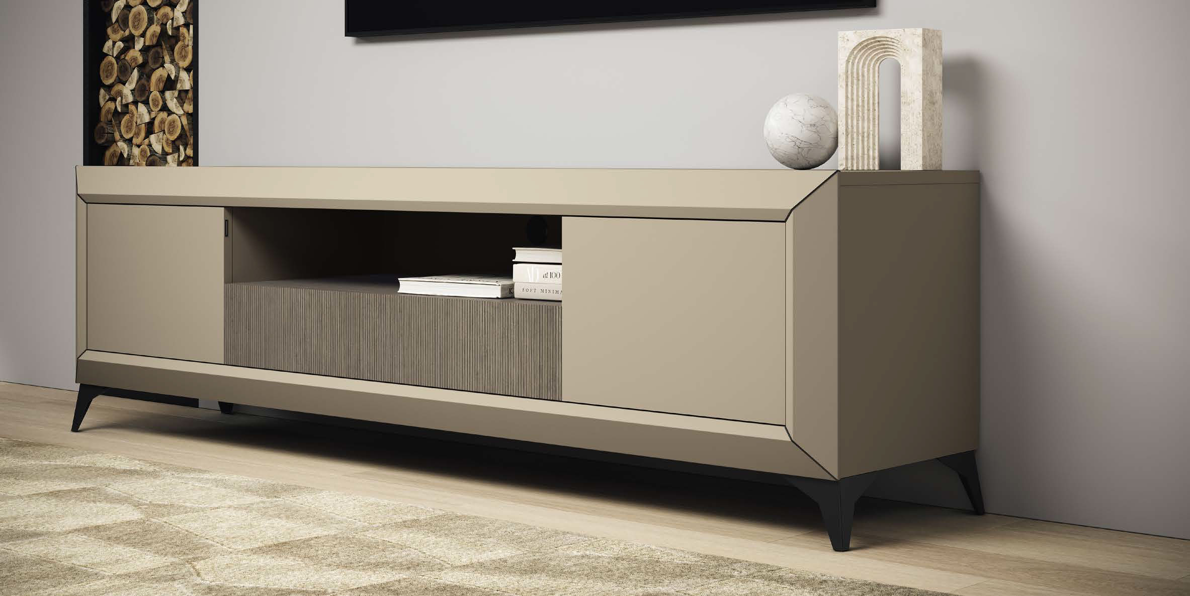 The Prestige Light Entertainment center is a masterpiece of Italian design by Camelgroup Italy, brought to you by ESF. This exquisite addition to our Wallunits and Entertainment Centers collection transforms any living area into a sanctuary of refined luxury. Every detail, from the bold, diamond-shaped cornices to the elegant, textured Urban Velvet surfaces, reflects a commitment to high-end aesthetics and superior quality.