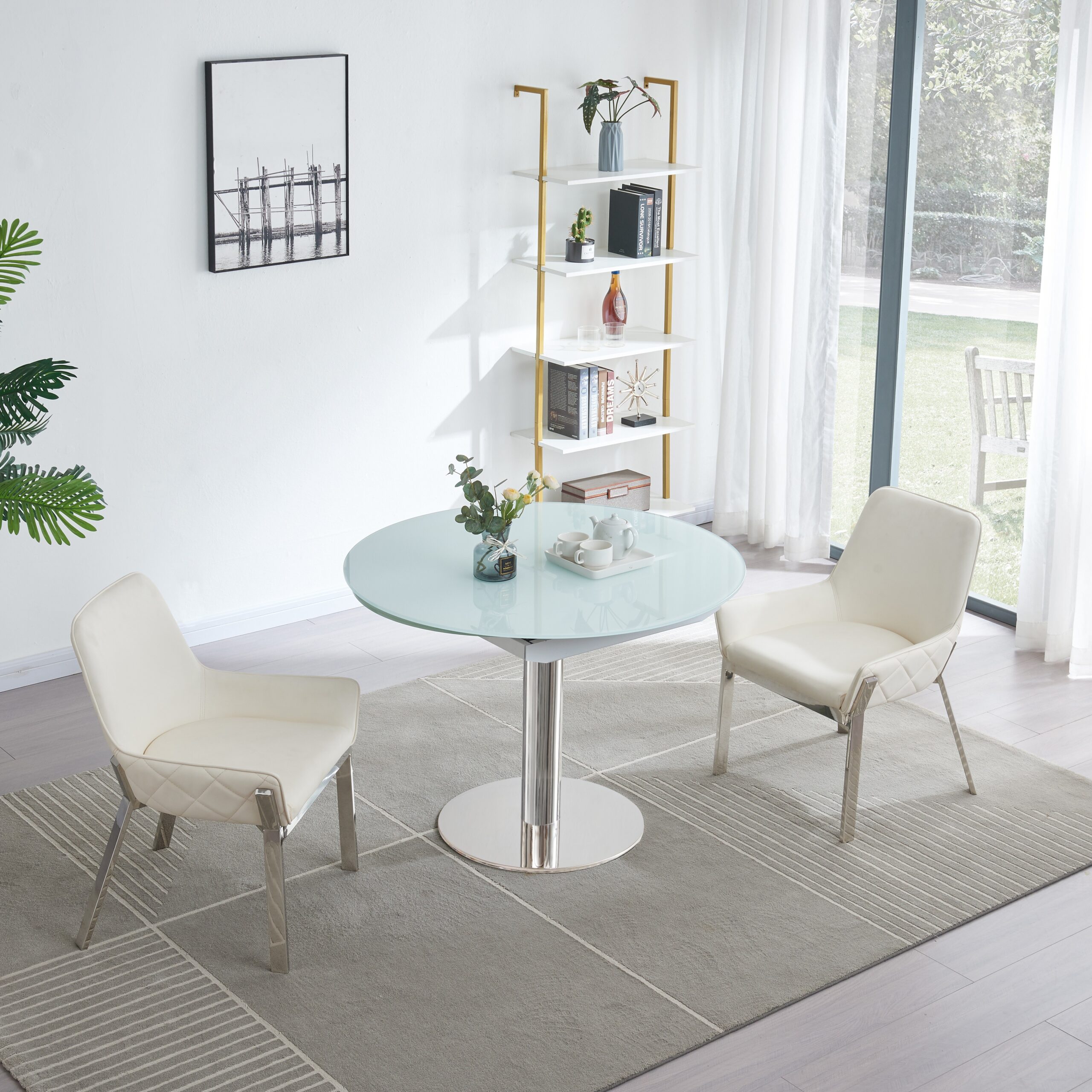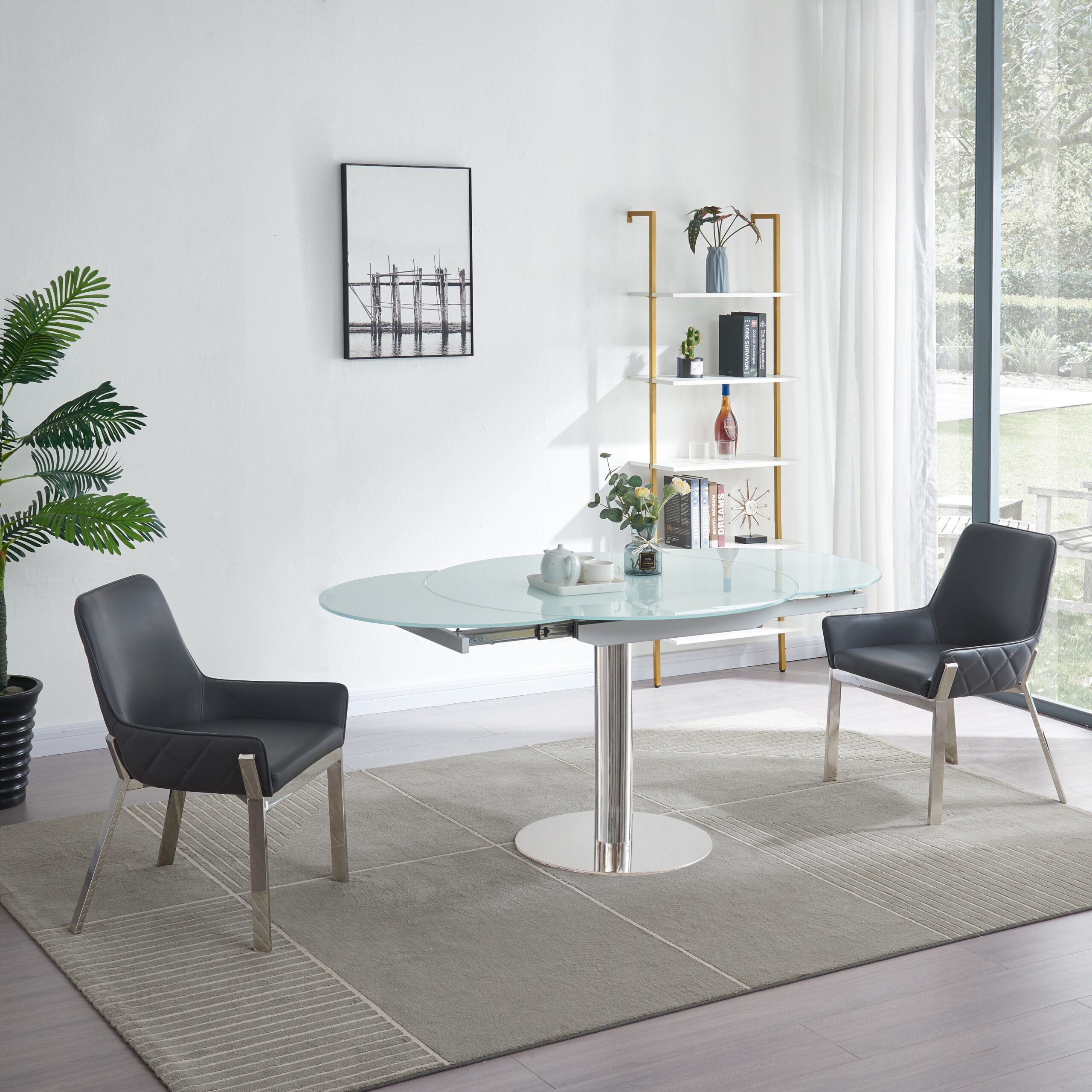 The Pub Dining Table is a modern take on intimate dining. The Pub Table allows for a minimal overall footprint in the home, while also providing ample space for everyday use. The white frosted glass top is accentuated by a polished steel base, lending itself to many home designs. The Pub table prominently features two pull out leaves, transforming itself from casual to entertaining in a moment’s notice.