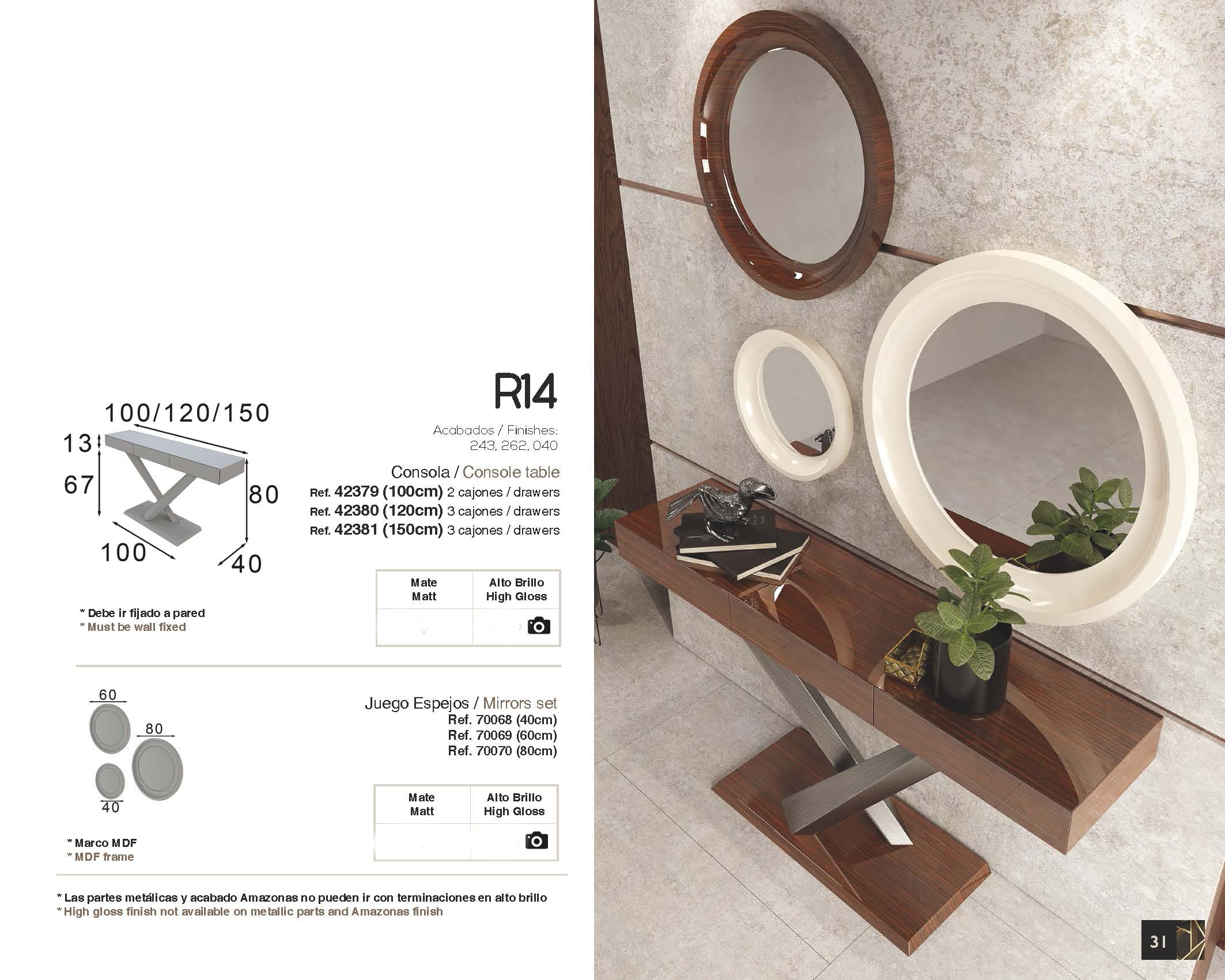 The R14 Console Table is a sophisticated masterpiece of Spanish craftsmanship, meticulously produced in Spain by the renowned manufacturer ESF. Belonging to the prestigious Franco Spain by ESF collection, this piece is designed to harmonize with any mirror from the same line, creating a cohesive and elegant look for your home. Its sleek design and high-end finishes, available in 243, 262, and 040 high gloss, reflect a modern aesthetic that elevates any interior.