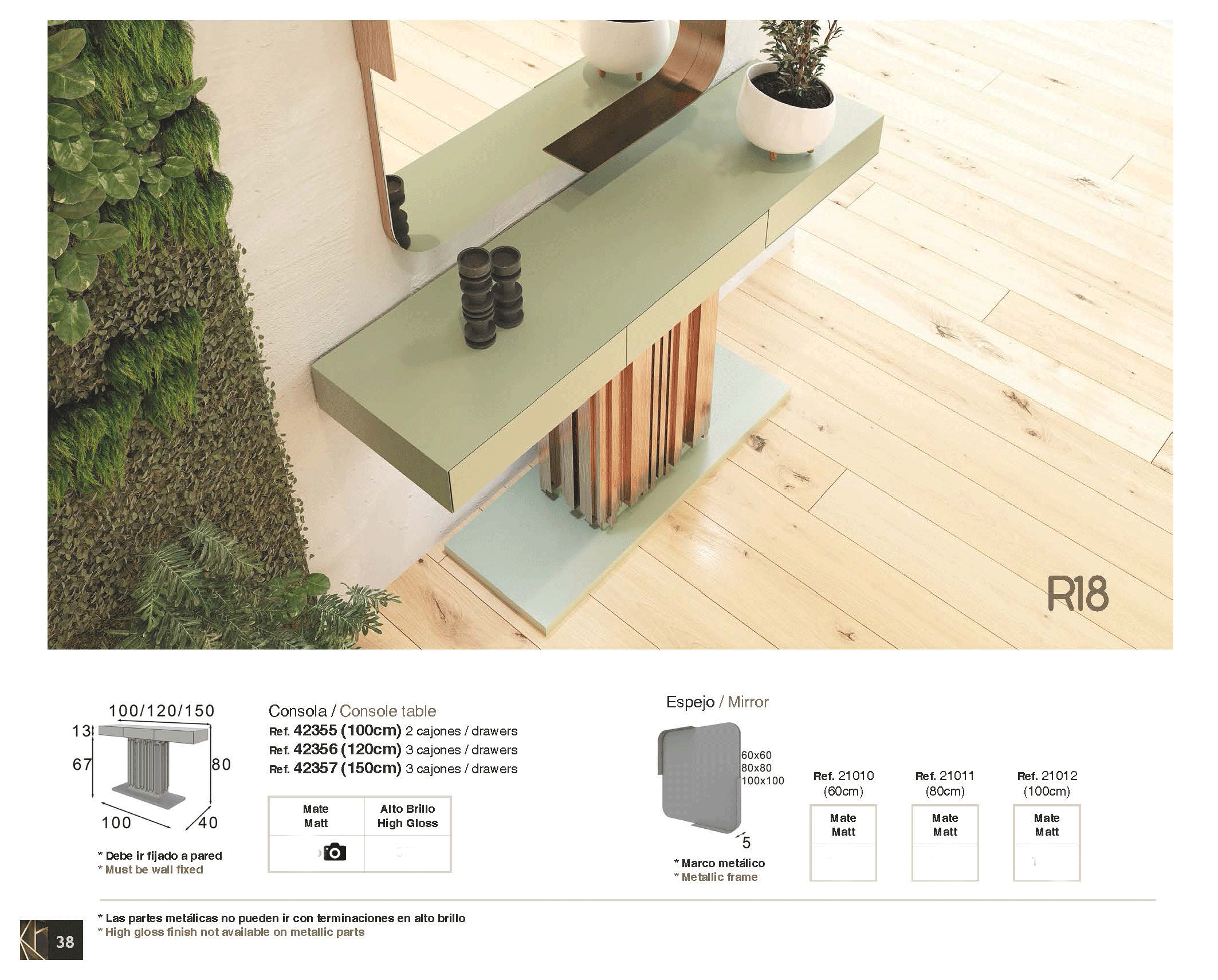 Crafted with meticulous attention to detail in Spain, this console table features a refined 141 and 043 matt finish that exudes understated luxury. Because it is designed for stability and a streamlined look, the unit must be wall-fixed, ensuring a secure and seamless fit against your interior walls. This modern console is part of a broader design language, allowing you to easily combine it with any mirrors from this exclusive collection to create a cohesive and high-end atmosphere.