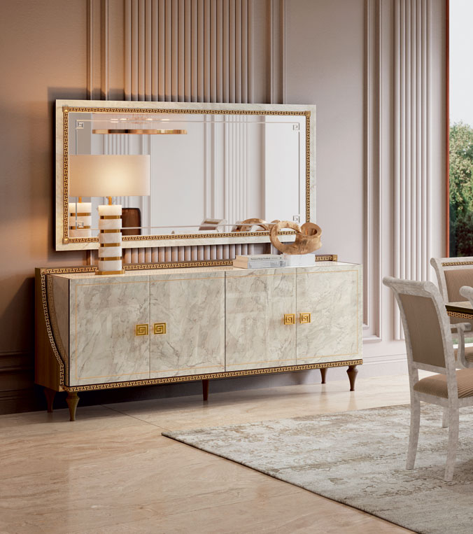 Experience the timeless allure of Italian craftsmanship with the Romantica 4 Door buffet / Mirror, a centerpiece that brings refined elegance to your home. Part of the Arredoclassic Italy by ESF collection, this exquisite set is a pure statement of style, blending the magic of classic aesthetics with original decorative flourishes. Designed to elevate your space, the buffet features stunning gold-finished decorative frames that catch the light and the eye, transforming any meal into a gala event.