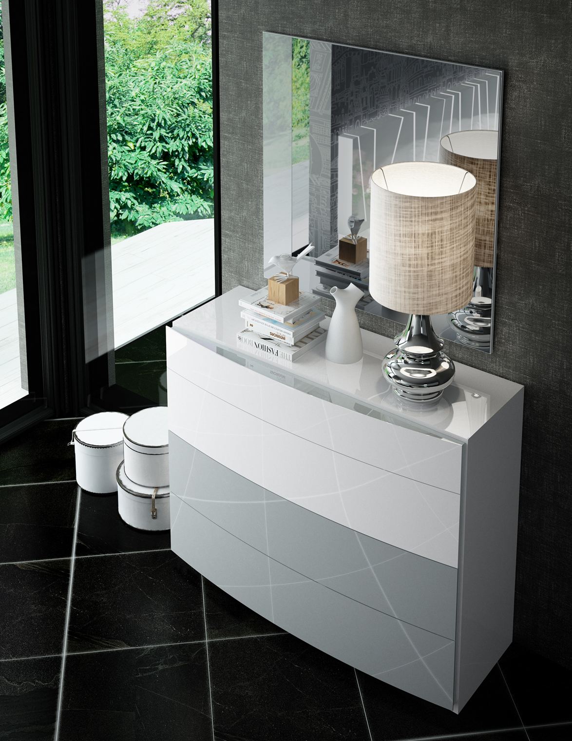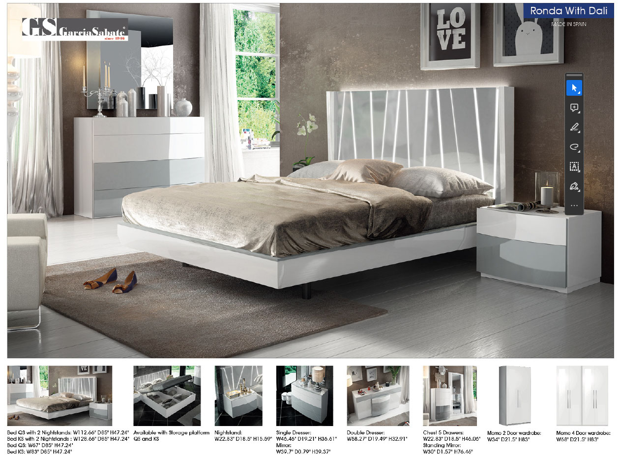 Crafted with precision in Spain by Garcia Sabate for the ESF collection, this ensemble represents the pinnacle of contemporary European artistry. The Ronda DALI King size Storage Bed is a centerpiece of sophisticated Bedroom Furniture > Beds, boasting a radiant high-gloss finish in white and light gray. Constructed from premium wood veneer and durable MDF, the set includes a platform bed with an integrated lighted headboard, two nightstands, a single dresser, and a matching mirror. Every element is designed for longevity and aesthetic grace, ensuring your primary bedroom remains a sanctuary of style.