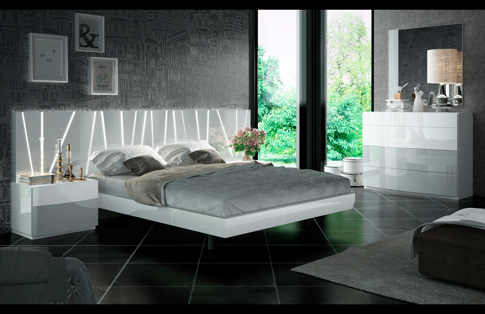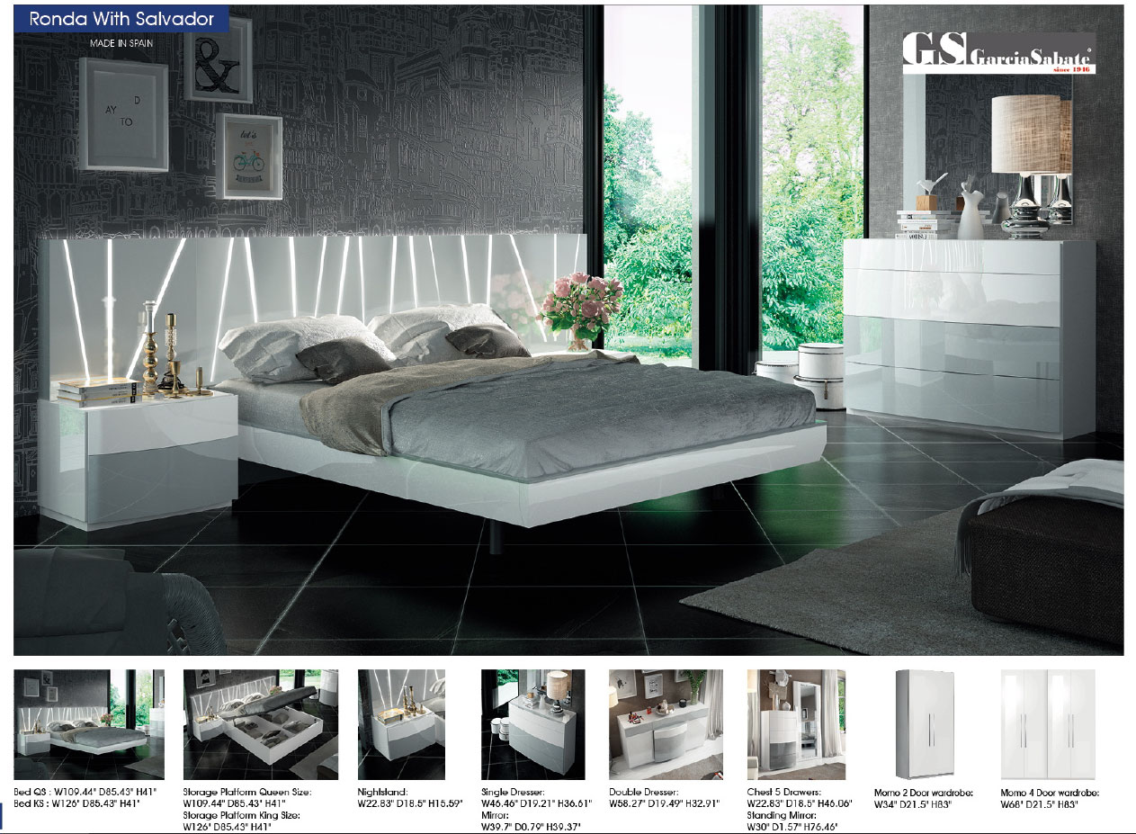 The Ronda with Salvador Bed serves as the centerpiece of this exquisite set, featuring integrated LED lighting that casts a soft, atmospheric glow. This comprehensive furniture arrangement includes two sleek nightstands and a dresser paired with a coordinating mirror. For those seeking to further elevate their space, a matching chest and a full-length floor mirror can be added to complete the ensemble. Every detail reflects a commitment to quality and avant-garde design, making this Spanish-made collection a premier choice for the discerning American homeowner looking to infuse their interior with artistic flair and modern functionality.