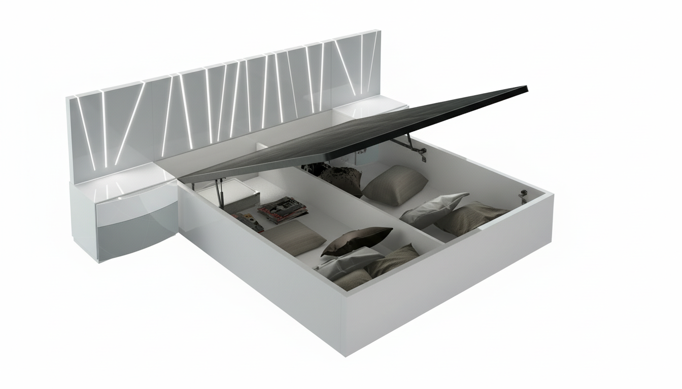 Expertly crafted in Spain by Garcia Sabate Spain by ESF, the Ronda SALVADOR King size Storage bed is a centerpiece of contemporary luxury within our Bedroom Furniture > Beds collection. This storage-focused bedroom set is meticulously constructed from premium wood veneer and MDF, finished in a striking high-gloss white and light gray. The design features a sophisticated platform structure that supports your mattress with a specialized folded wooden slats frame and adjustable legs, ensuring both comfort and durability. Integrated lighting within the headboard adds a layer of modern functionality and ambiance, transforming your primary bedroom into a refined sanctuary of European style.