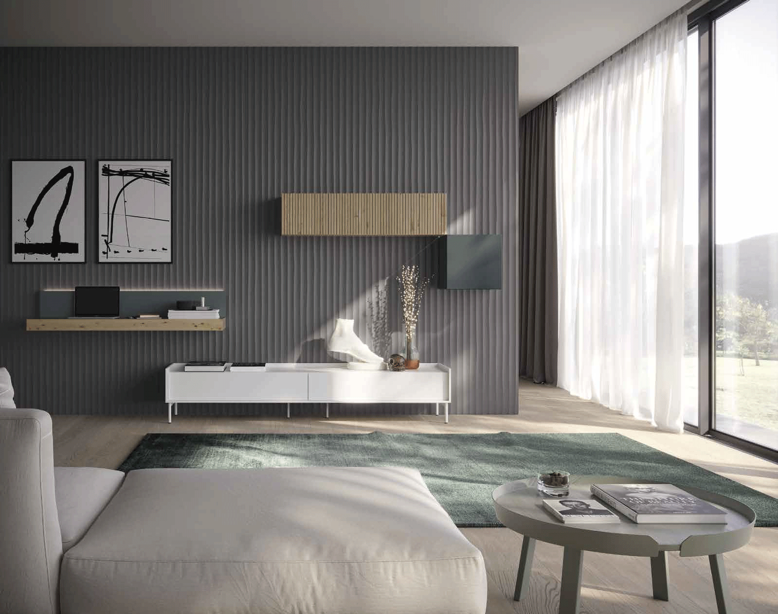 The refined and clean lines of the RP009 make it an ideal centerpiece for a sophisticated living room, where it effortlessly integrates a dedicated workspace into the home environment. Its unique color palette, featuring Blanco Mate, Roble Montana, and Verde Comodoro Mate, creates a striking visual volume that captures the essence of contemporary functionality. This furniture program is designed to offer a complete range of modules, allowing you to furnish your entire home with a cohesive and high-end look.