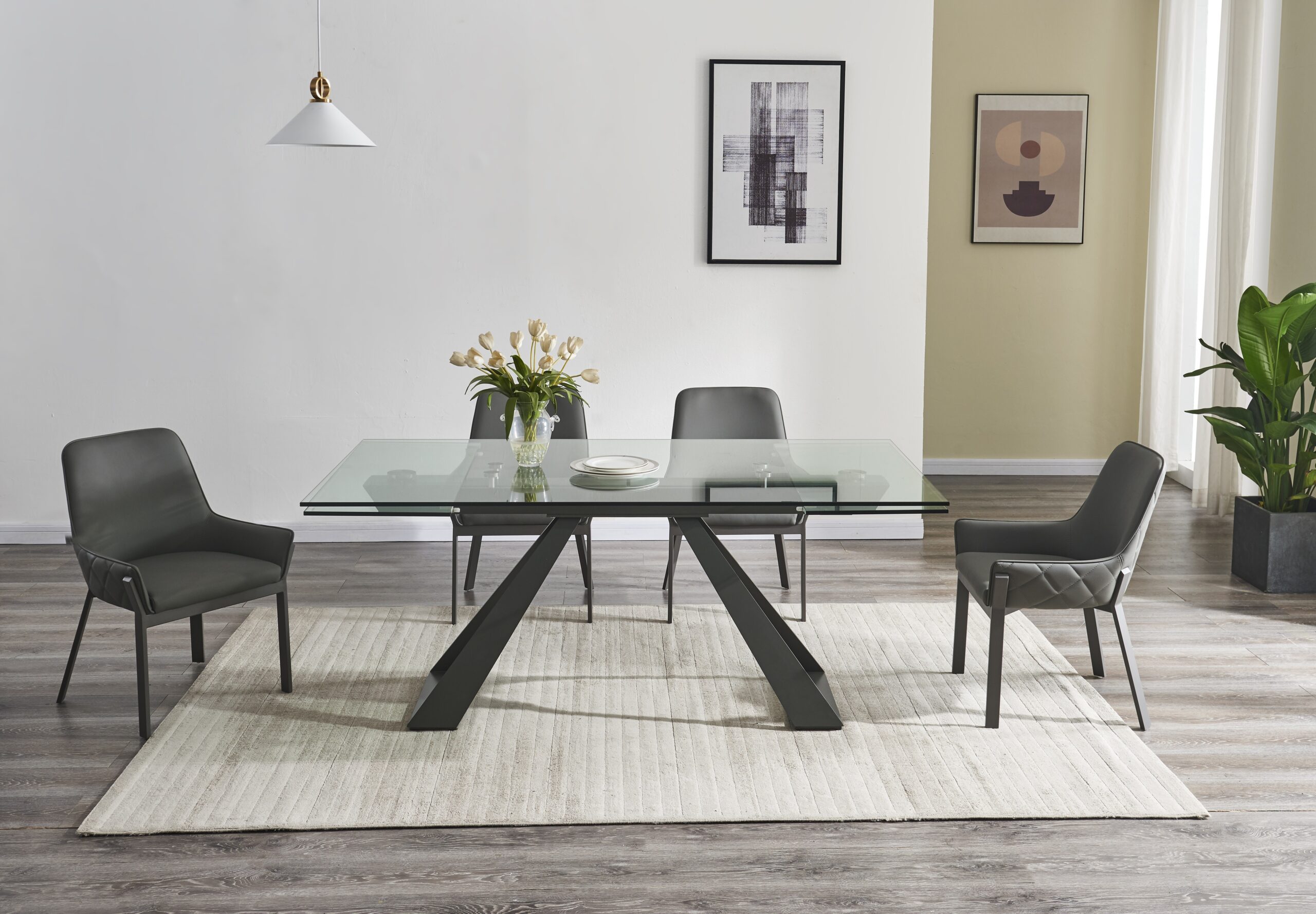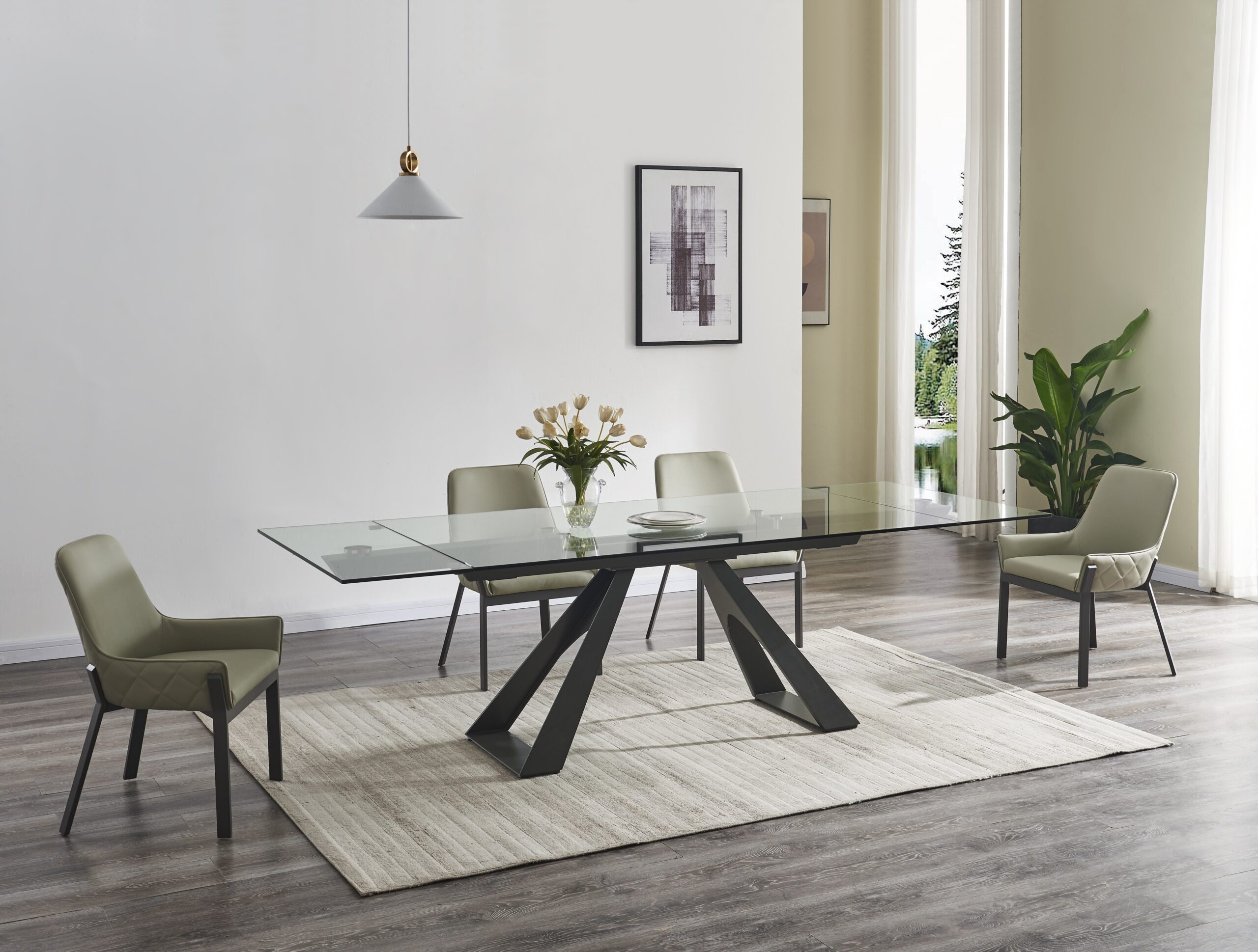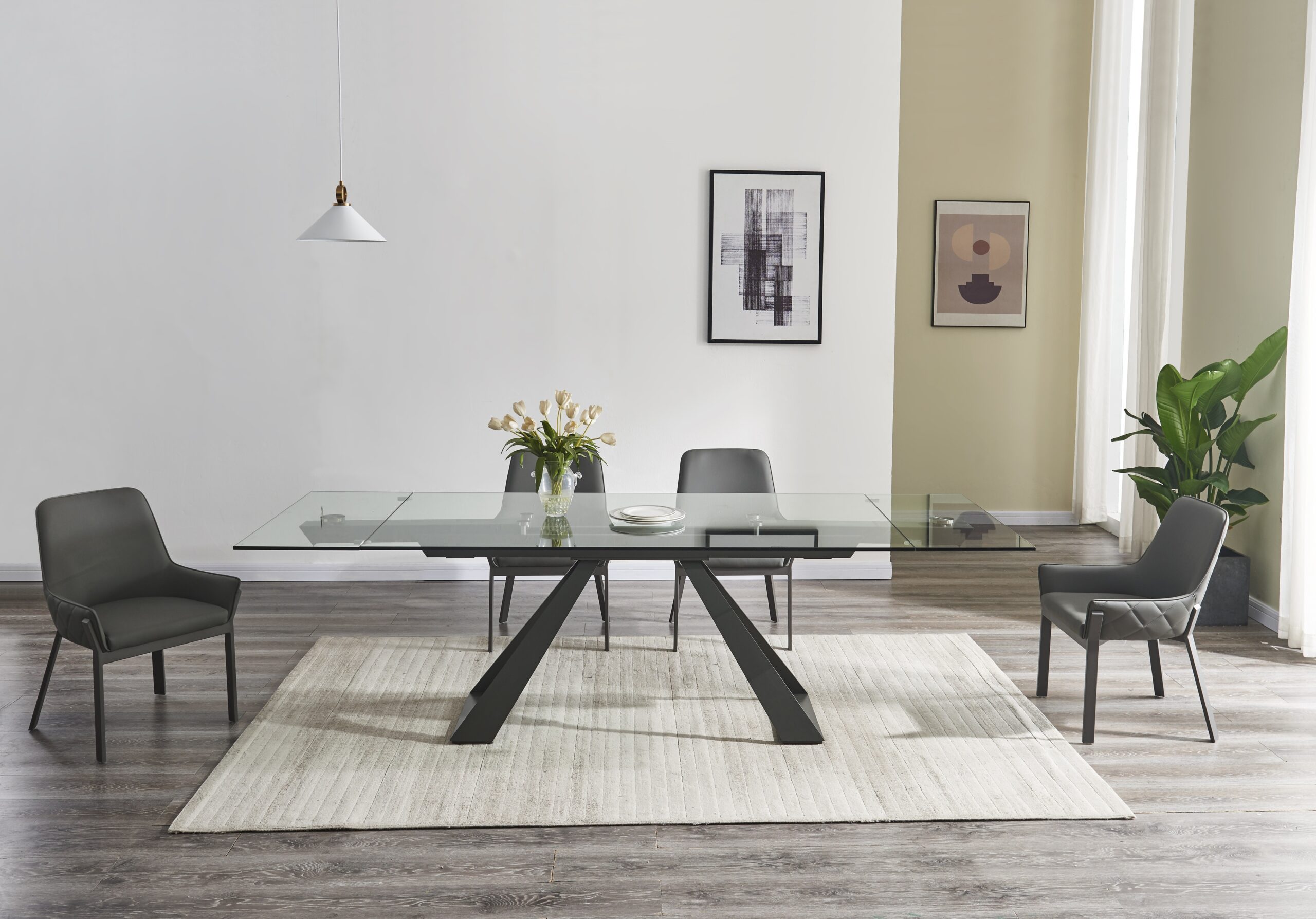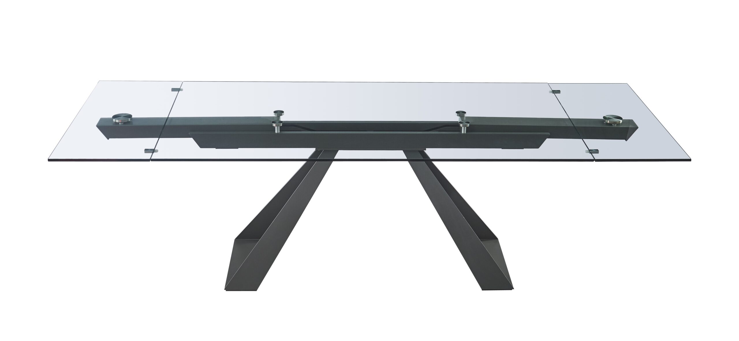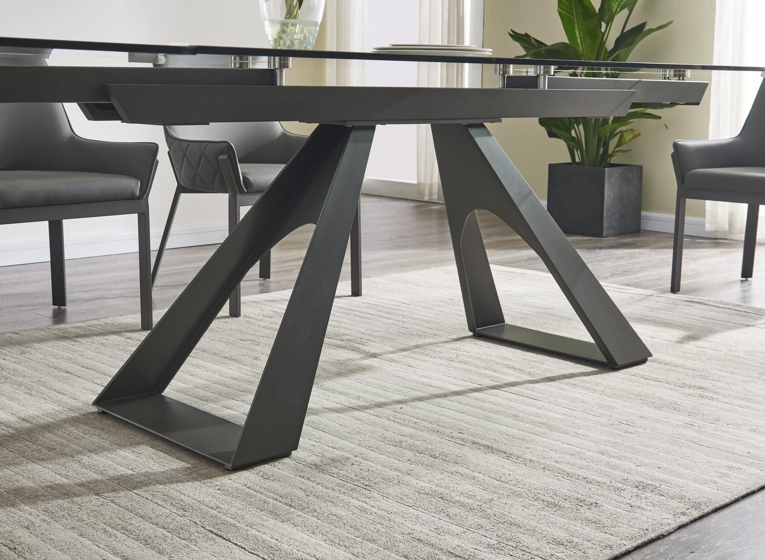 The San Diego Extension Table features a tempered glass top, with extensions on either side, resting upon an elegant grey gunmetal powder coated steel base. The table extensions feature an easy glide mechanism, to seamlessly allow it to transition depending on your dining needs.