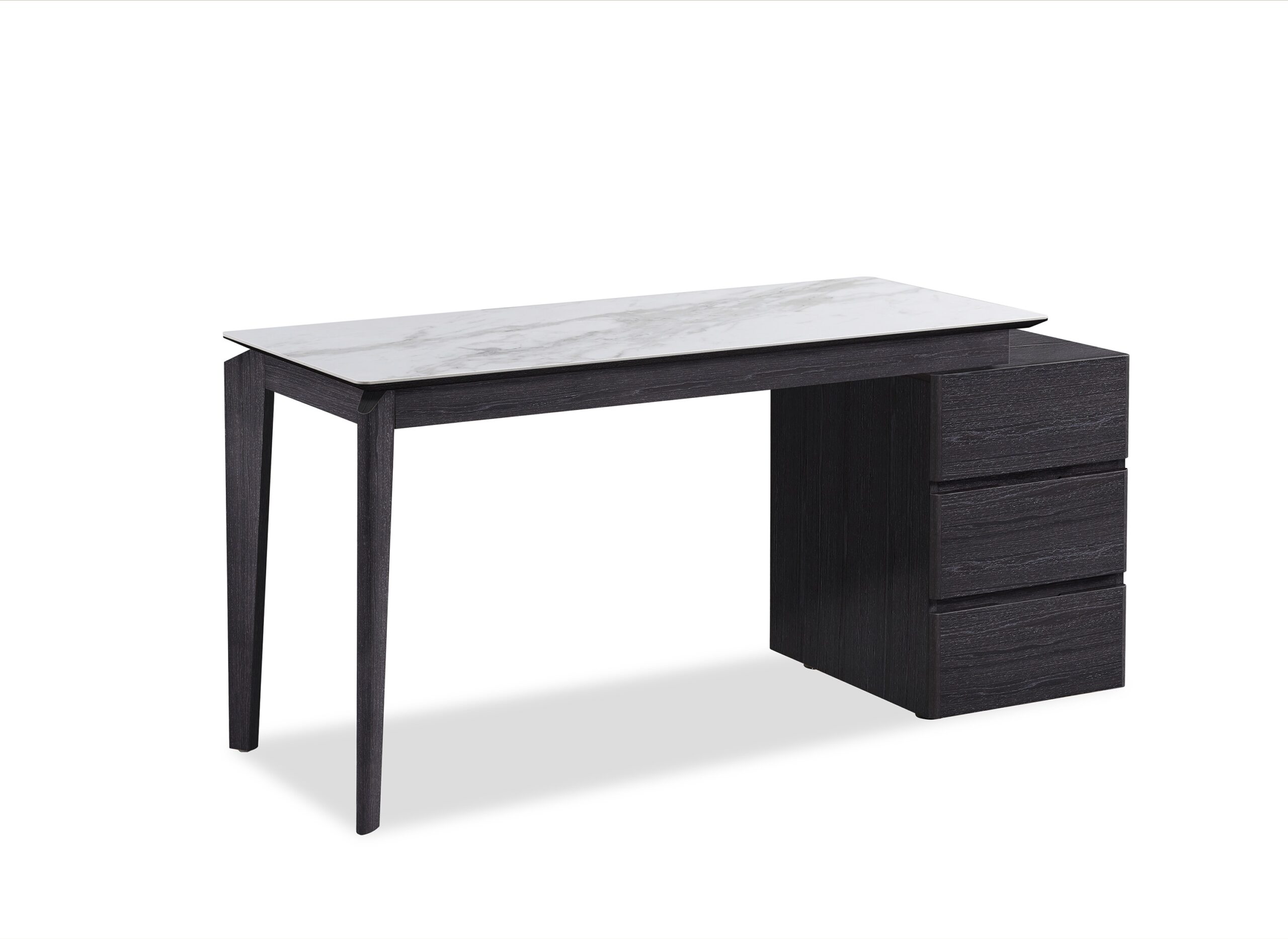 The Slate desk by J&M is innovative in its combination of luxurious materials, bringing together the best that ceramic and oak veneer has to offer. The Slate’s tabletop is comprised of a specially crafted ceramic, feauturing the beauty and complexity of carrara stone. Another prominent feature of the Slate is its ample storage, providing three sizable drawers to accommodate your office needs. The perfectly complemented Grey-Ash stained oak veneer surrounds the base of the desk on all sides, making this desk a true marvel to behold at any angle.