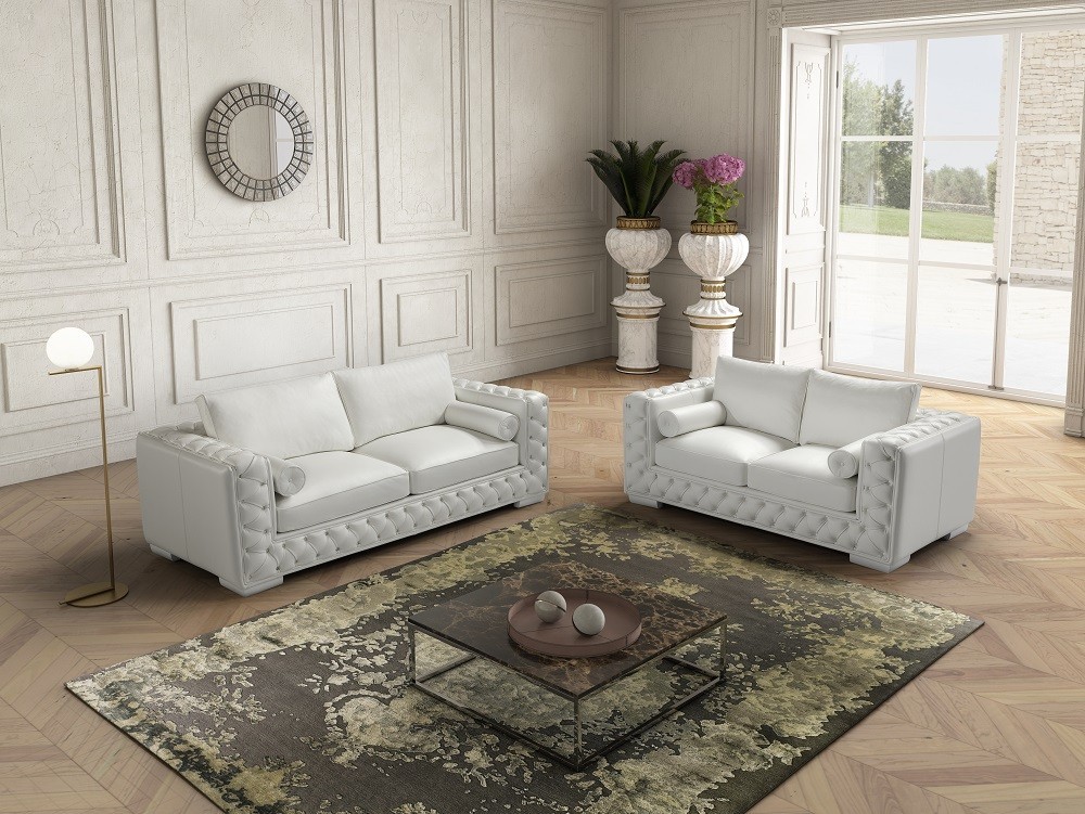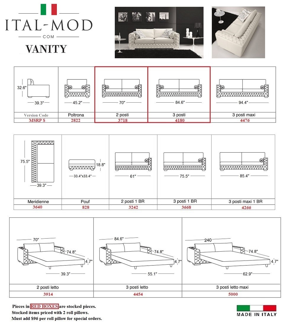 J&M is proud to introduce our new line of furniture Designed, Produced, and imported from Italy. This collection is crafted using the finest of materials, durable solid wood construction, premium thick Italian leather, & comfortable yet resilient fabrics. All of this plus full customization of dimensions are what make these items a pinnacle of Italian manufacturing. The Vanity Leather sofa features a intricate capitone hand tufted design.This sofa is stocked as shown in a Sofa and Love & includes 2 roll pillows. This sofa can be special ordered in a wide array of leather, fabrics & configurations.