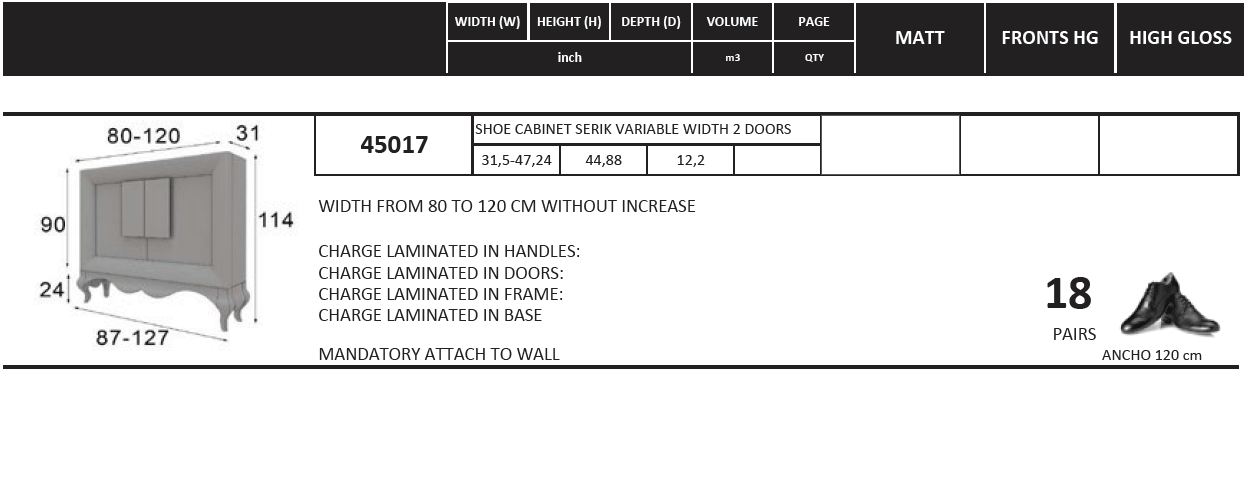 Elevate your home organization with the Z40, a masterpiece from the Franco Antike Shoe Cabinets collection. Proudly made in Spain, this special edition shoerack represents a new era for Franco Furniture, blending refined elegance with modern sophistication. Every detail of this piece exudes style, transforming a functional necessity into a statement of luxury. Meticulously constructed from high-quality wood-based panels and MDF, the Z40 utilizes premium special order materials to ensure lasting durability and a superior finish. Its sleek design fits seamlessly into upscale interiors, though it must be securely attached to the wall for optimal safety and stability. Part of the exclusive Franco Spain by ESF collection, this cabinet is designed for those who appreciate the intersection of artistry and utility. Whether placed in a grand entryway or a master suite, the Z40 brings an air of Mediterranean grace to your space while keeping your footwear perfectly organized.